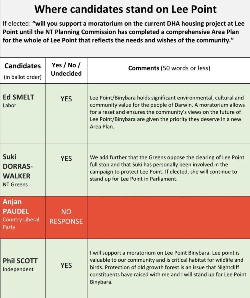 Three out of the four candidates support a new Area Plan for Lee Point and a moratorium on development until it happens. Mr Anjan Paudel did not respond to the the survey – read more